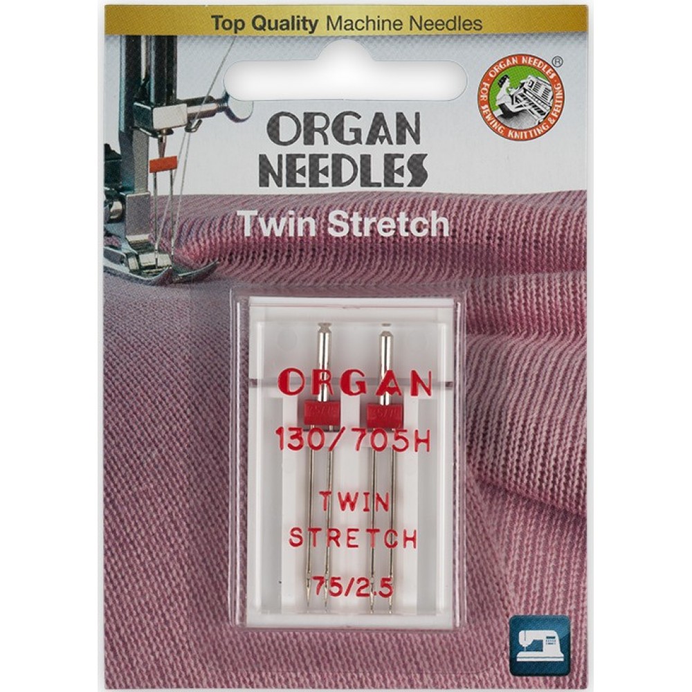 Игла Organ двойная супер стрейч 2-75/2,5 - это набор из двух двойных игл ( расстояние между иглами 2,5 мм) для шитья трикотажных тканей
