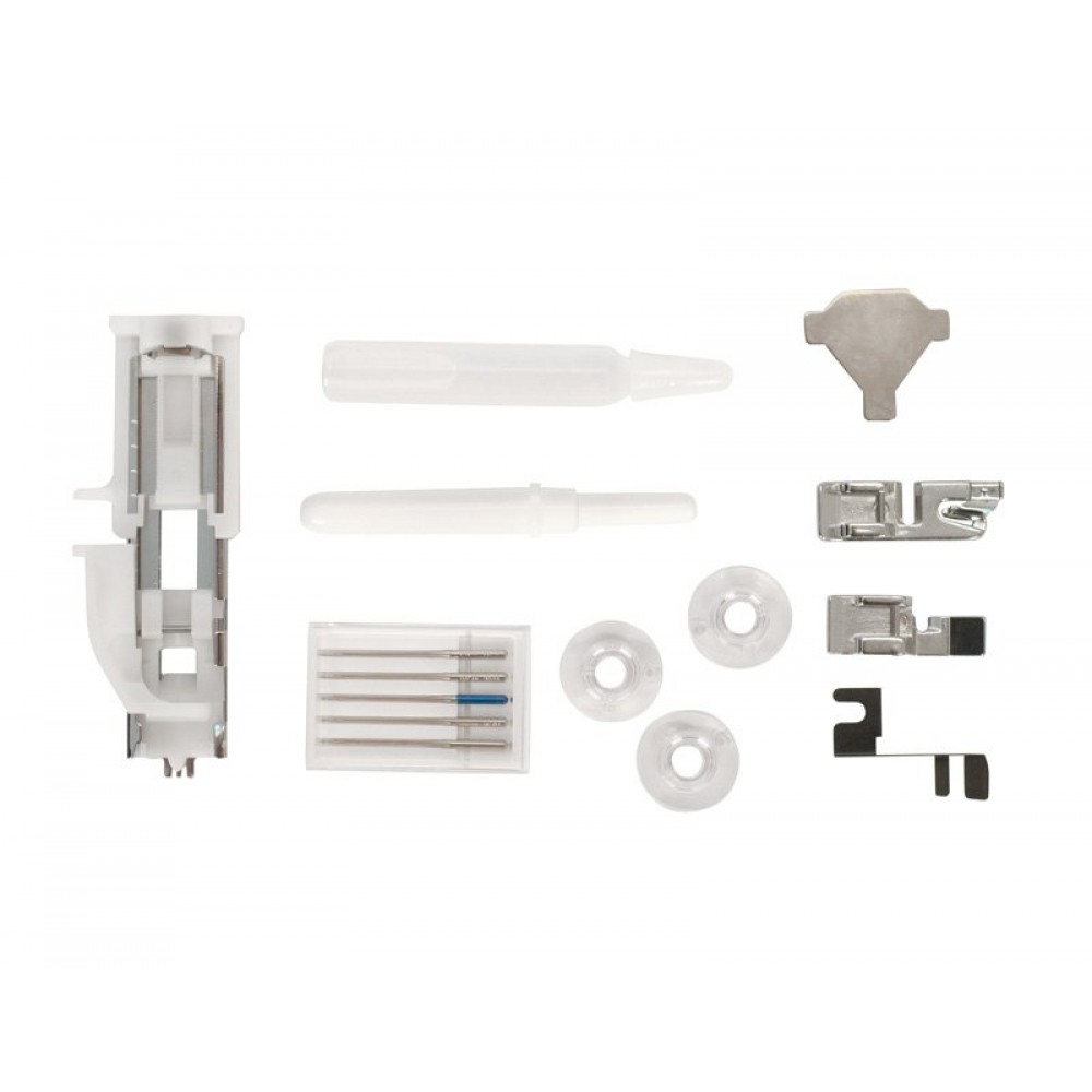 | Комплектация | лапка универсальная;лапка для молнии;лапка для петли;лапка-улитка;набор игл;шпульки;отвертка;распарыватель;масло;направитель для потайного шва;педаль;инструкция на русском языке. |