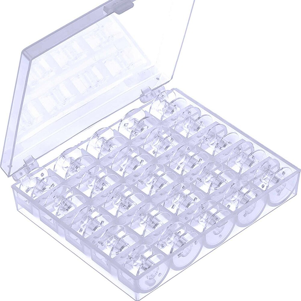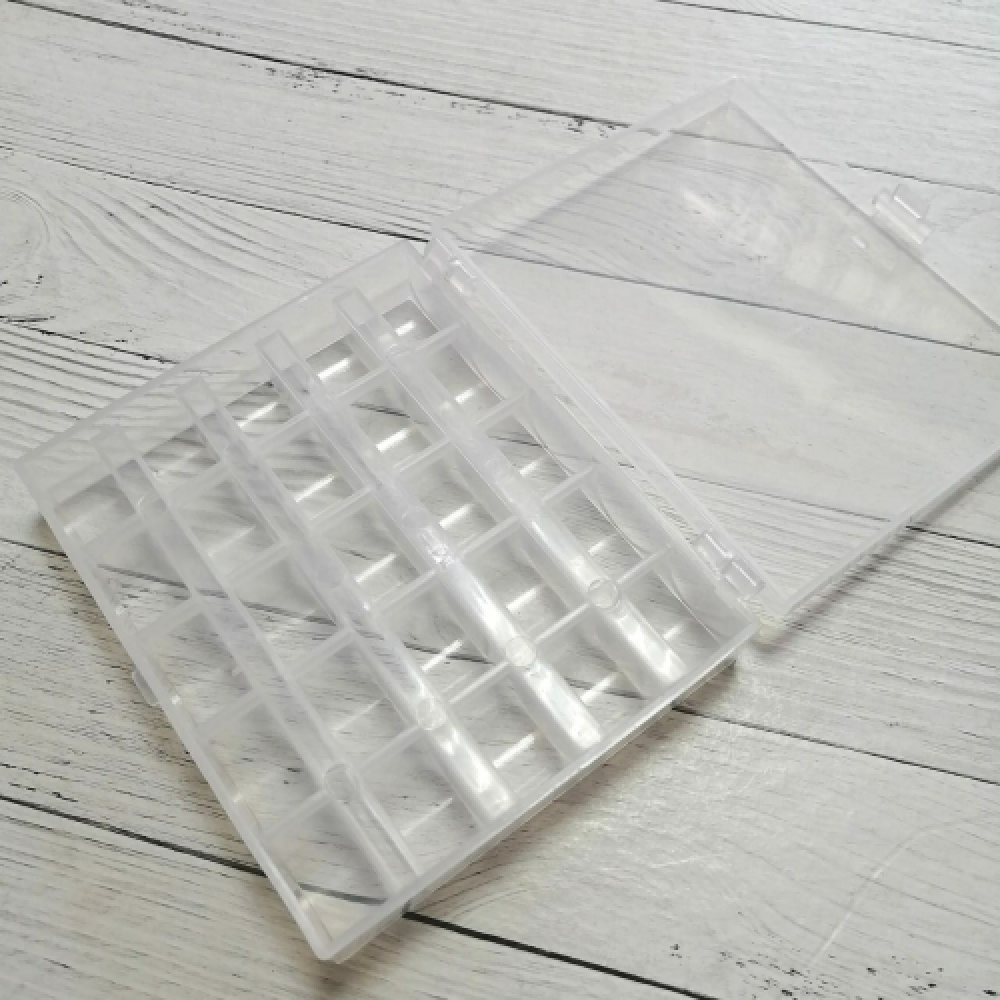 Контейнер сделан из прозрачного пластика, что позволяет видеть содержимое. Разделен на 25 ячеек для хранения шпулек для швейные машин. Крышка плотно закрывается. Шпульки всегда будут в одном месте, а намотанная нить на шпульках не будет разматываться.