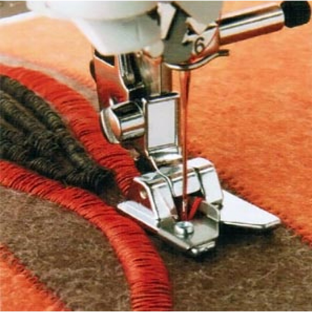 Лапка для букле и бахромы для бытовых швейных машин. Образование букле на поверхности ткани обеспечивается строением самой лапки. По мере продвижения лапки по ткани, на её поверхности будут появляться вытянутые нити, т.е. букле. Ширина зиг-зага может быть максимальной. Длина стежка более частой. Выполнив несколько строчек подряд, можно таким образом украсить низ рукава, изделия, горловины. С помощью этой лапки Вы можете выполнить "мережку" и украсить свое изделие изумительной бахромой. Подходит для большинства современных швейных машин.
