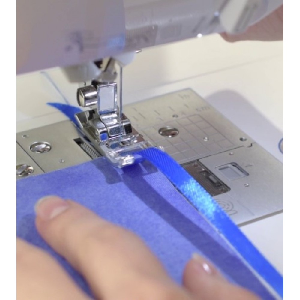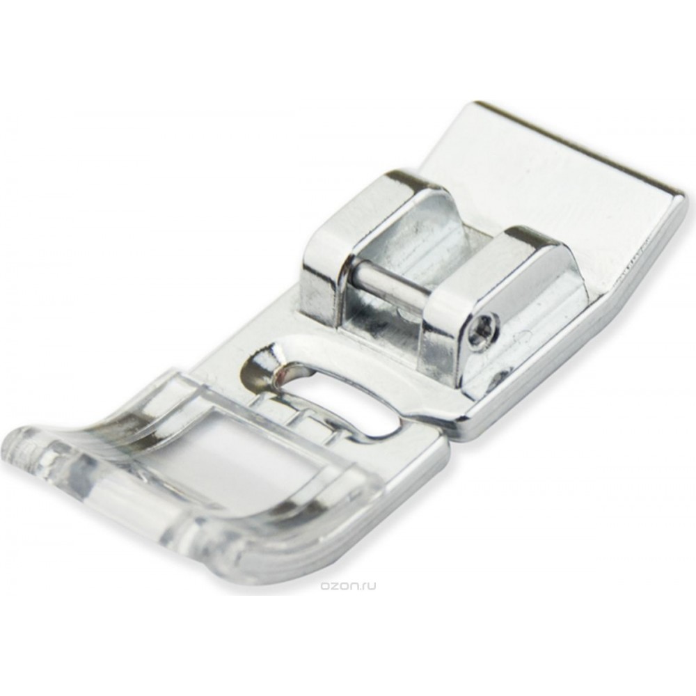 Лапка используется для пришивания лент и тесьмы. Благодаря прозрачному пластику увеличивается обзор рабочей зоны и контроль над процессом. За счет направляющего отверстия лента или тесьма ложится ровно, получая при этом равномерную строчку. Дополнительного эффекта можно добиться с помощью декоративных строчек.