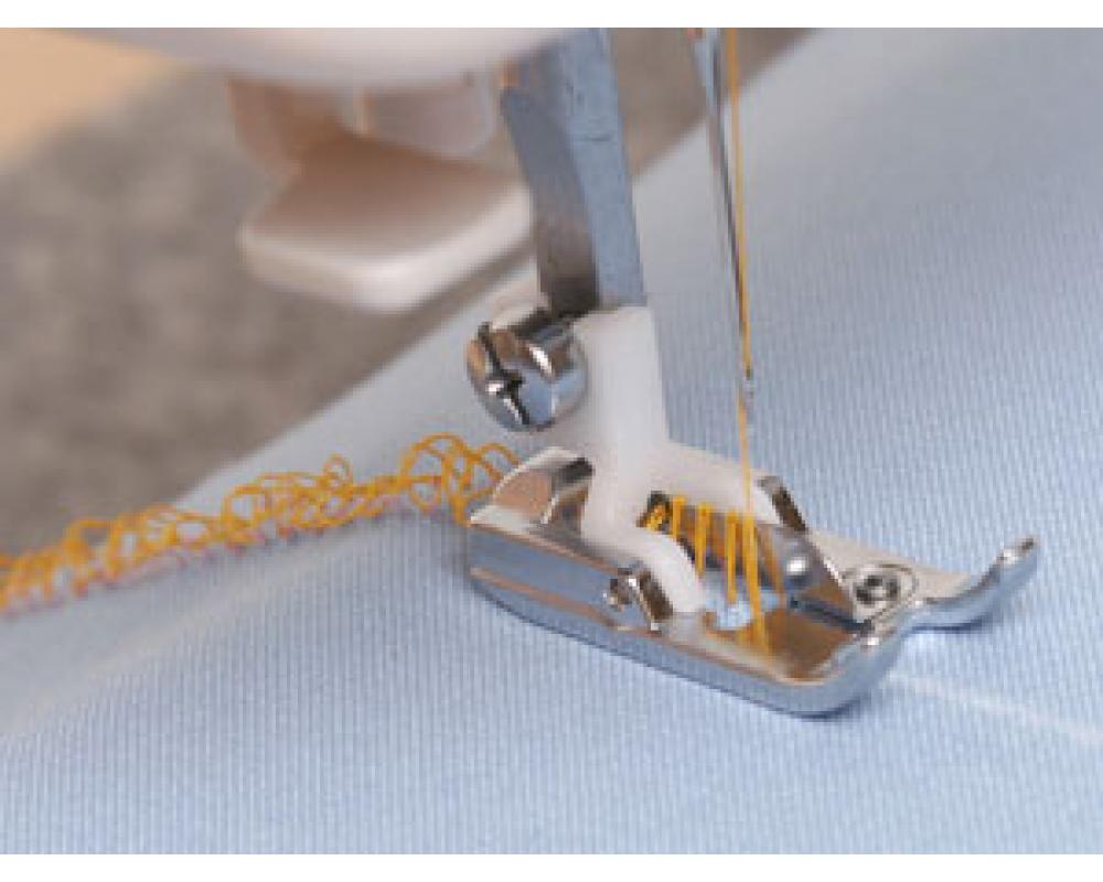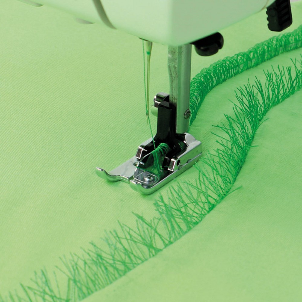 Лапка для букле и бахромы для бытовых швейных машин. Образование букле на поверхности ткани обеспечивается строением самой лапки. По мере продвижения лапки по ткани, на её поверхности будут появляться вытянутые нити, т.е. букле. Ширина зиг-зага может быть до 5 мм. Длина стежка более частой. Выполнив несколько строчек подряд, можно таким образом украсить низ рукава, изделия, горловины. С помощью этой лапки Вы можете выполнить "мережку" и украсить свое изделие изумительной бахромой.