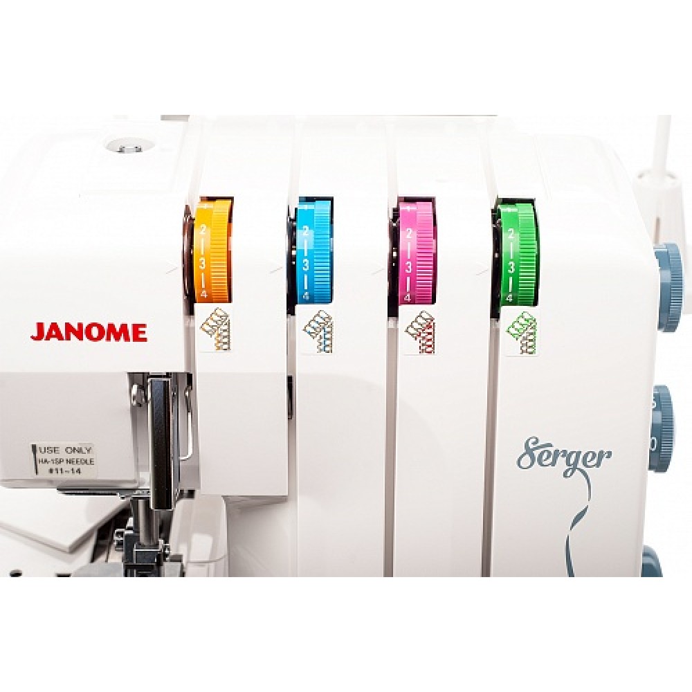 Janome 9880 выполняет 2/3/4 ниточные швы, имеет в комплекте мусоросборник и работает с различной плотностью тканей.