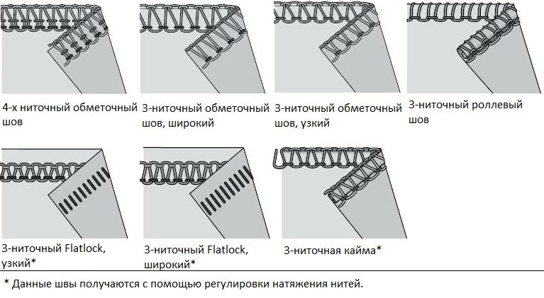 | Выполняемые швы | 4-х ниточный оверлочный шов с укрепительной строчкой 3-х ниточный плоский шов-имитация (широкий)3-х ниточный плоский шов-имитация (узкий) 3-х ниточный оверлочный шов (сверхэластичный)3-х ниточный оверлочный шов (широкий) 3-х ниточный оверлочный шов (узкий) 3-х ниточный ролевый шов |
