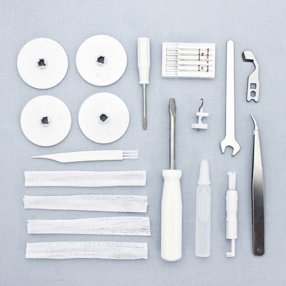 | Комплектация | ПедальИнструкцияМусоросборникОтвертка большаяОтвертка малаяПинцетГаечный ключНитевдеватель для машинМаслоНабор иглЗапасной ножДержатели катушки, 4 шт.Сетки для катушек, 4 шт.ЩеточкаКонвертер для работы в режиме 2-х ниточного шва |