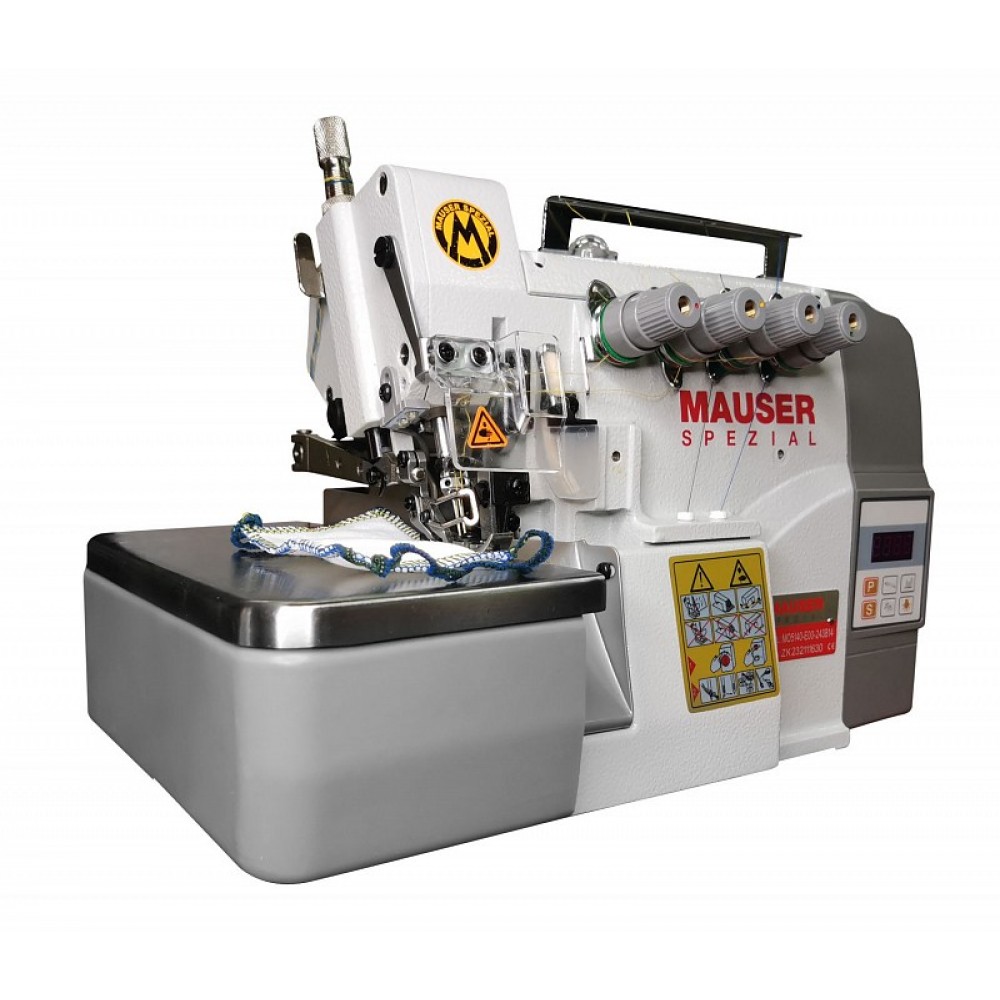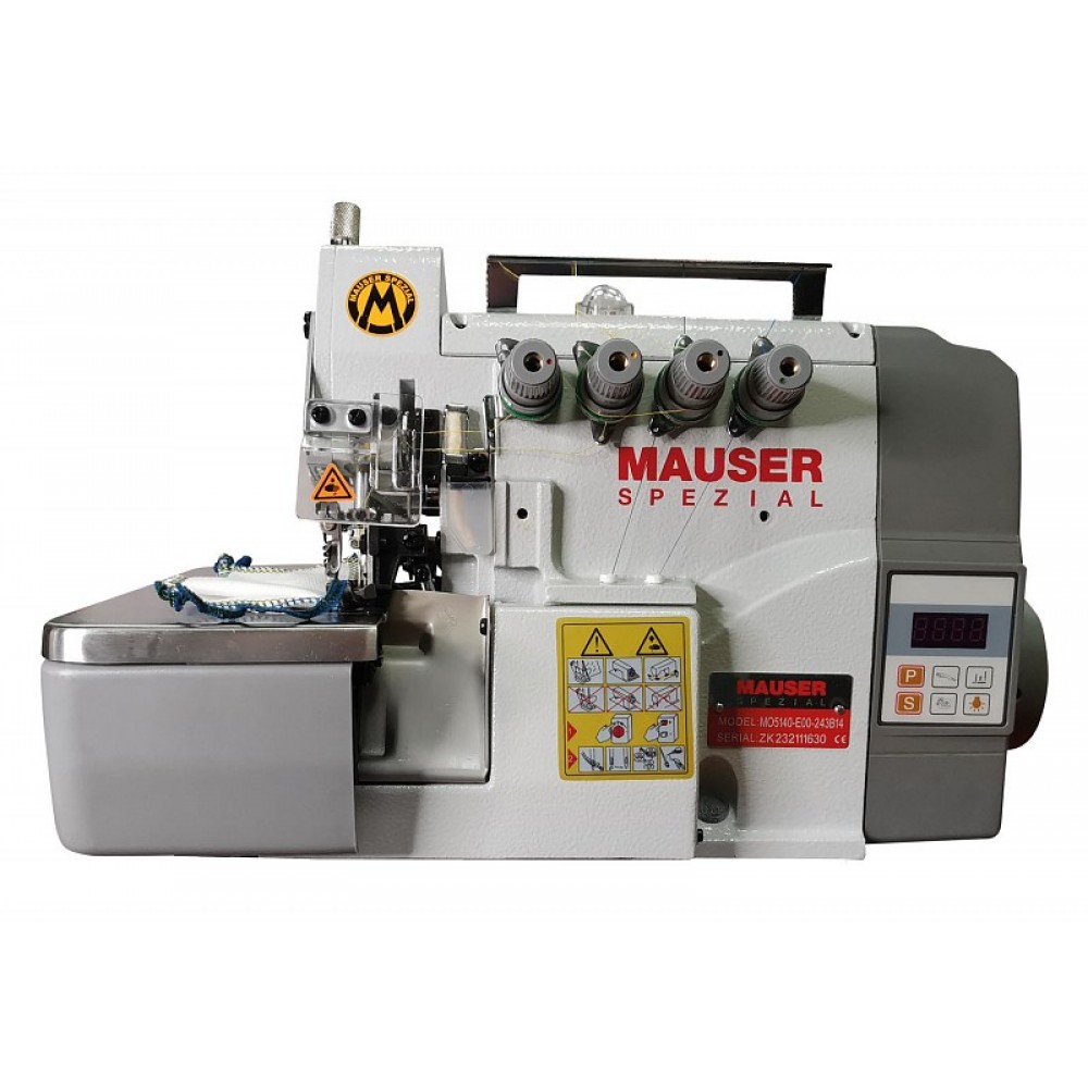 Высокоскоростной промышленный двухигольный четырехниточный оверлок Mauser Spezial MO5140-E00-243B14 со встроенным мотором, позиционированием иглы и плавным набором скорости. Предназначен для обметывания краев и стачивания деталей швейных изделий из трикотажных, хлопчатобумажных, шерстяных, шелковых, льняных и синтетических материалов с одновременной обрезкой края. Есть подсветка поля шитья.