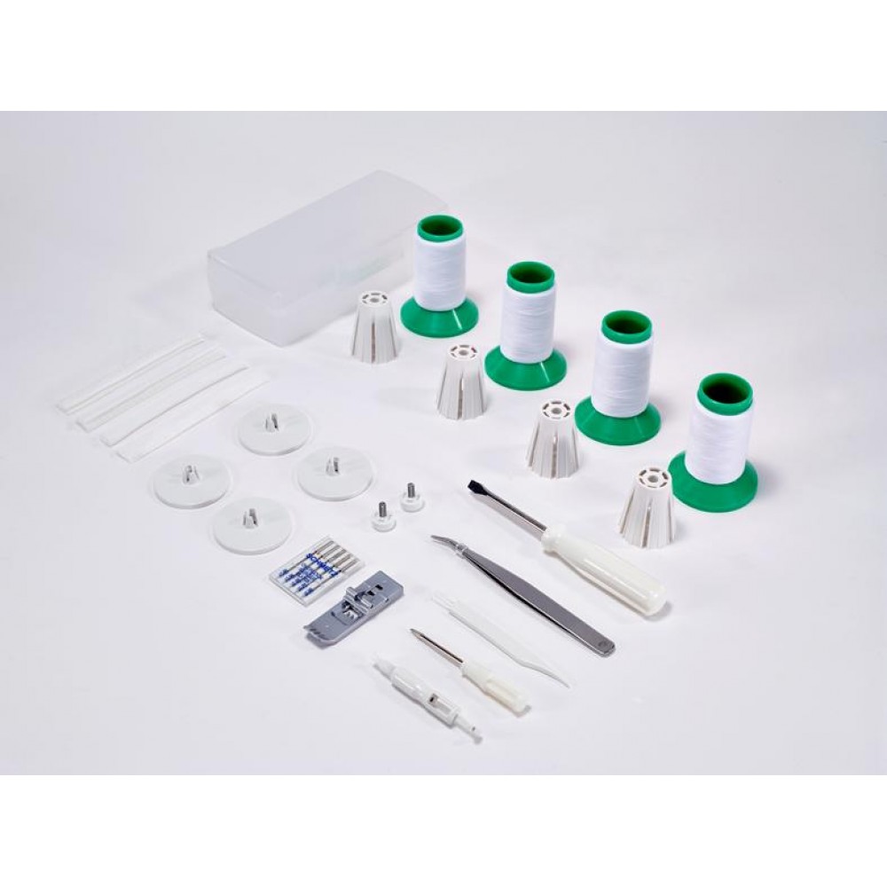 | Комплектация | 4 катушкодержателя,2 отвертки (средние и малые), пинцет,нитевдеватель, 4 больших ограничителя,4 сеточки для катушек, щеточка от пыли,2 крепёжных винта, набор игл, педаль ии коробка для хранения аксессуаров |