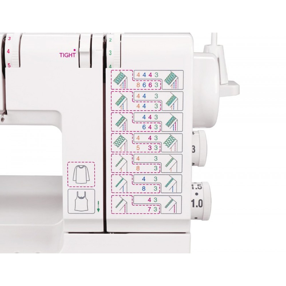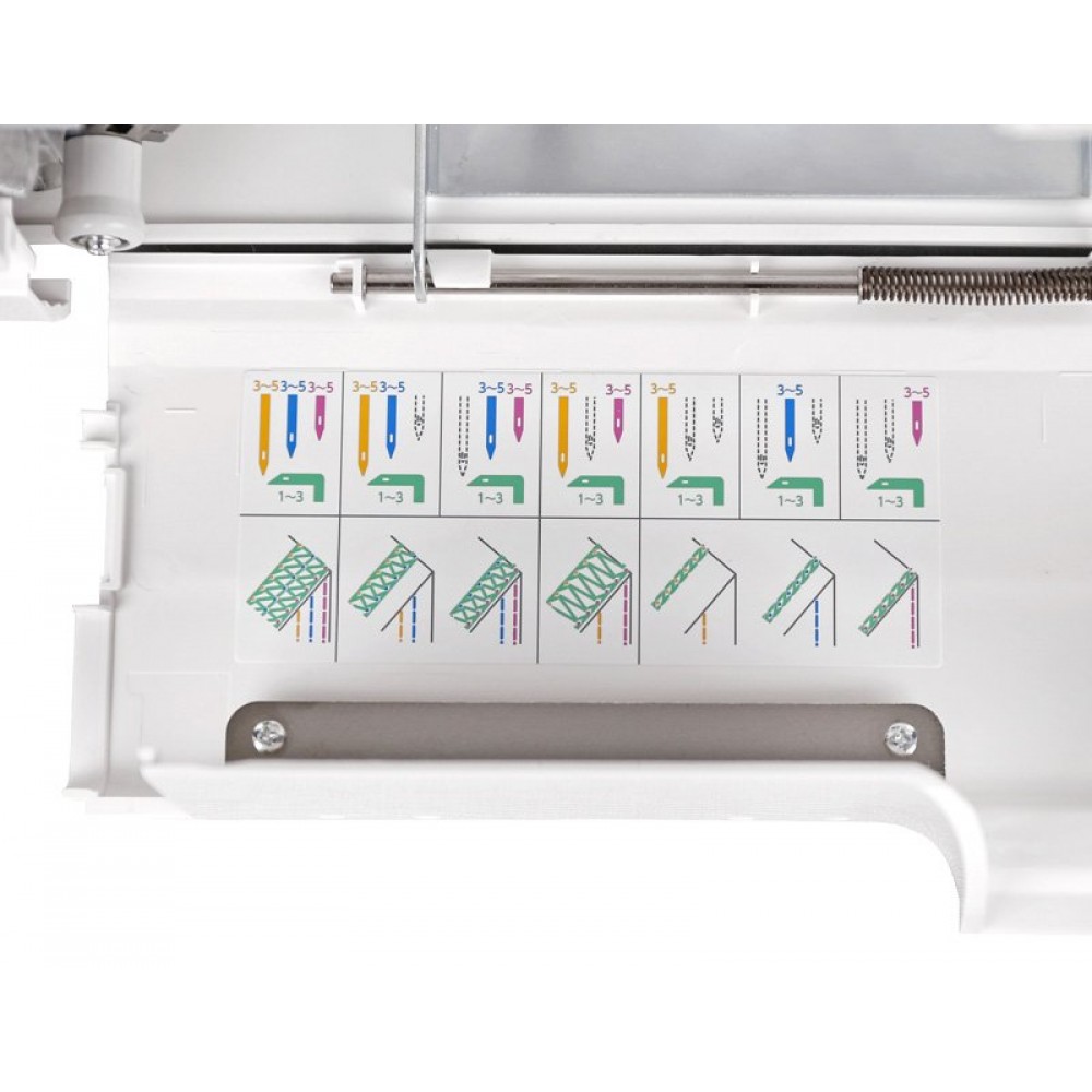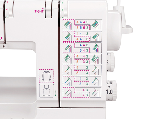 На передней панели распошивальной машины Janome Cover Pro D MAX нанесена схема подсказок, которая указывает рекомендуемые настройки. Теперь не нужно доставать инструкцию, чтобы посмотреть установки натяжений игольных нитей и нити петлителя. При необходимости натяжения можно изменять.