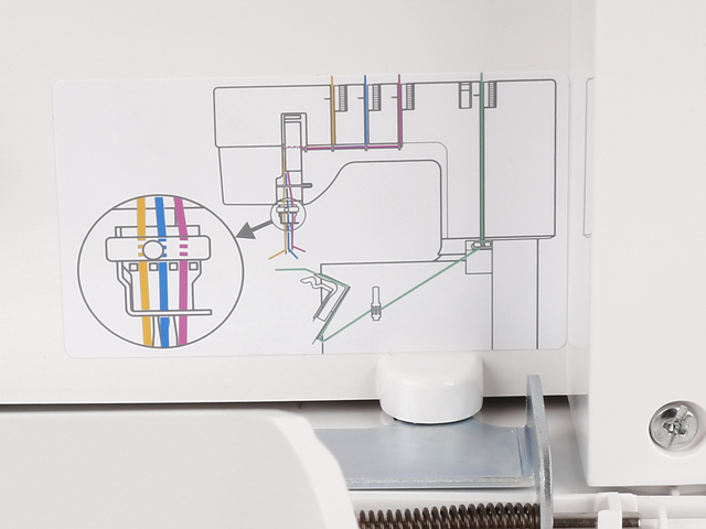 Заправка швейной машины Cover Pro D MAX занимает минимум времени благодаря схеме, нанесенной на внутренней панели машины. Путь каждой нити выделен цветом.