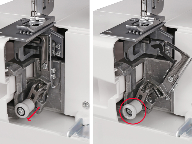Влевать нить в петлитель швейной машины Cover Pro D Max тоже стало проще!. Просто потяните на себя рычаг отключения и петлитель наклонится вправо, чтобы обеспечить максимальный доступ для заправки. Вденьте нить и верните рукой петлитель в первоначальное положение.