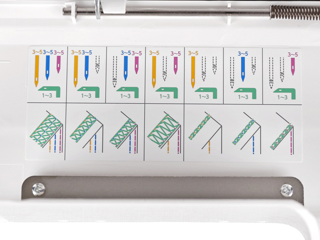 Для вашего удобства на откидной крышке имеется швейный советник, который указывает рекомендуемый диапазон регулировок натяжений нитей для каждого шва. В швейном советнике каждая нить выделена своим цветом.