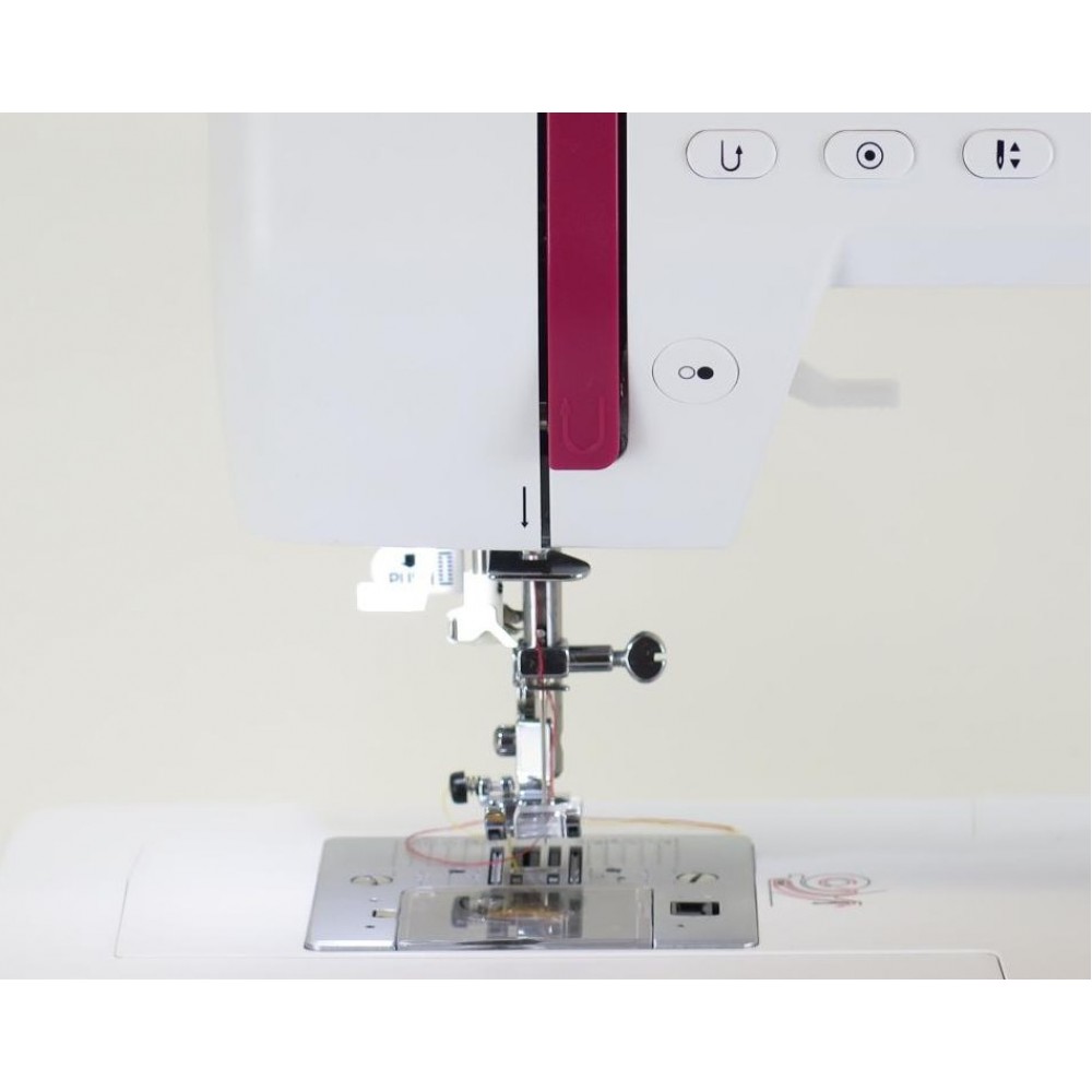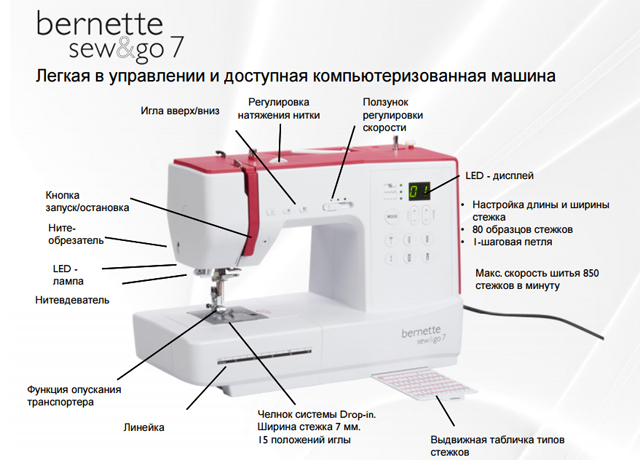 Челночное устройство у Sew&go 7 горизонтальное с системой заправки Drop-in с легкостью заправит даже начинающая швея, а теперь оно стал еще лучше и Вам не нужно вытягивать нижнюю нить вручную.Bernette Sew&go 7 предоставит Вам такие возможности, как шитье без педали, плавная регулировка скорости, позиционирование иглы, отключение субчатой рейки и многое другое.В прямом доступе на панели машины Вы найдете кнопки изменения длины стежка и ширины строчки, а так же выбора основных швейных операций. Все изменения можно будет увидеть на дисплее.Стоит отметить достаточно высокую для бытовой швейной машины скорость шитья - до 850 ст/мин. Для освещения производитель использовал экономичные LED-лапмпы большой яркости и долгим сроком службы.