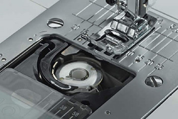 Швейная машина оснащена горизонтальным челночным устройством с прозрачной шпулькой и прозрачной крышкой, через которую очень удобно контролировать остаток нити на шпульке. Такое челночное устройство не требует смазки и в него очень удобно заправлять шпульку, а шитье можно начинать без предварительного поднятия нижней нити наверх. Преимуществом перед моделями с вертикальным качающимся (класическим) челноком является более тихая и плавная работа без вибрации и пропуска стежков, поскольку челнок вращается, а не качается. Надо отметить, что в машинах с горизонтальным челноком значительно реже запутывается нижняя нить.