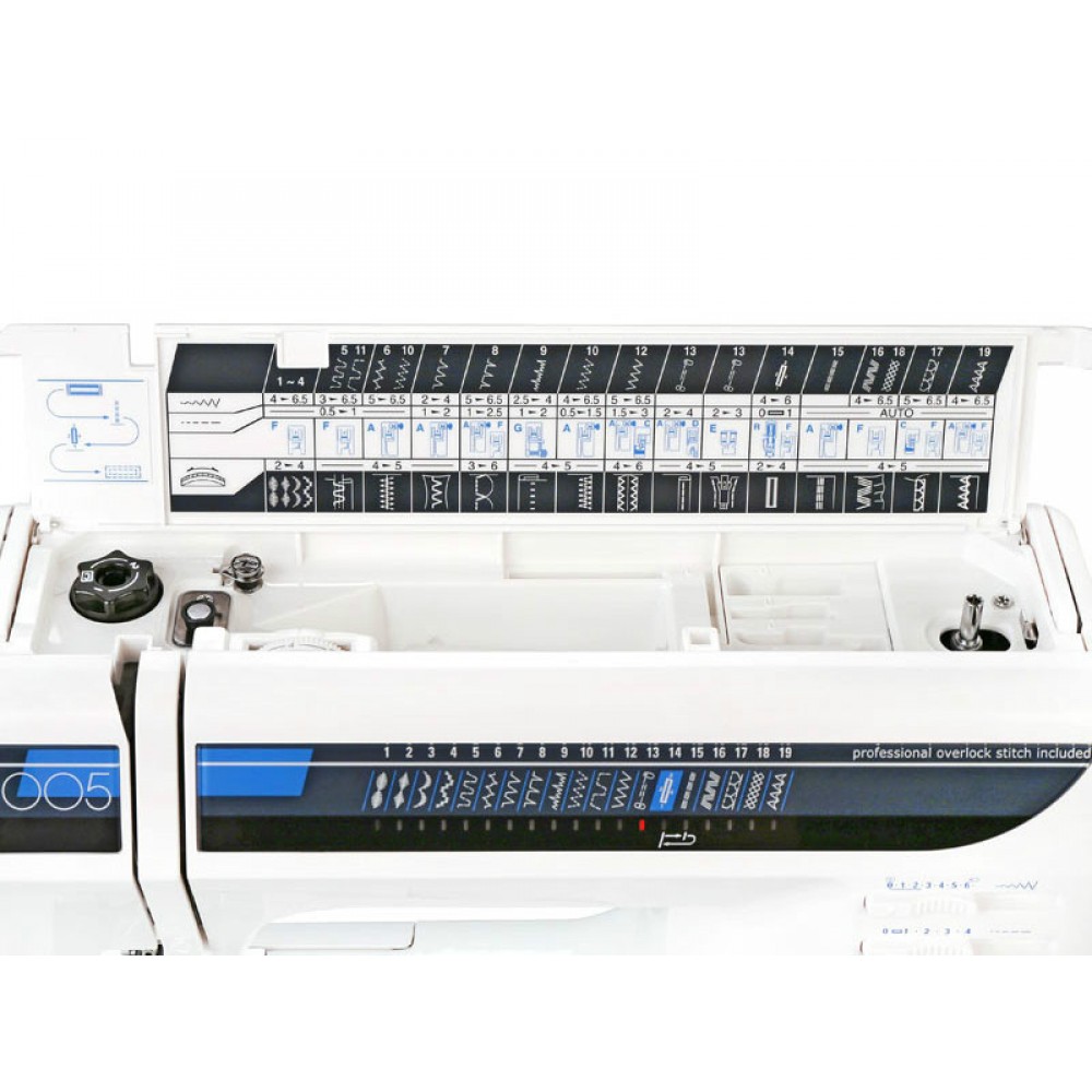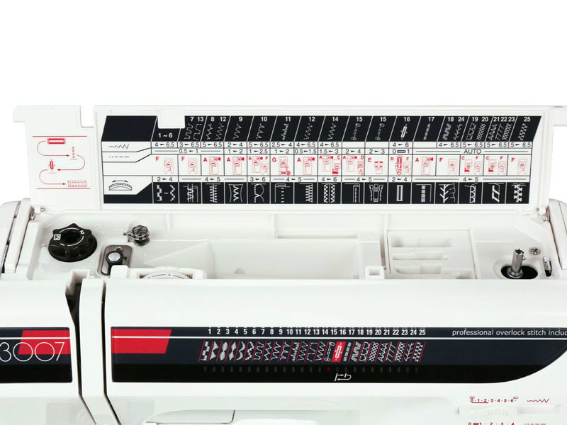 На верхней откидной крышке расположен швейный советник, который подскажет Вам нужные параметры стежка (длину, ширину и натяжение верхней нити), а также рекомендуемую лапку для выбранной операции.