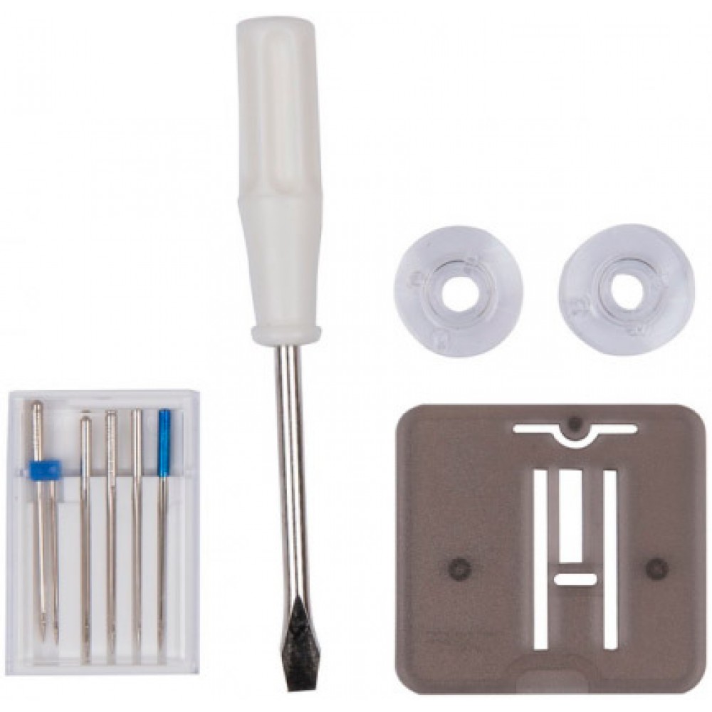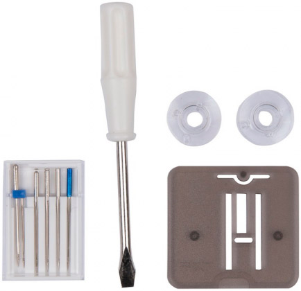 | Комплектация | Универсальная лапка. Лапка для выполнения пуговичных петель. Штопательная пластинка. Вспариватель. Комплект игл (3 шт.). Шпульки. Педаль. Инструкция |