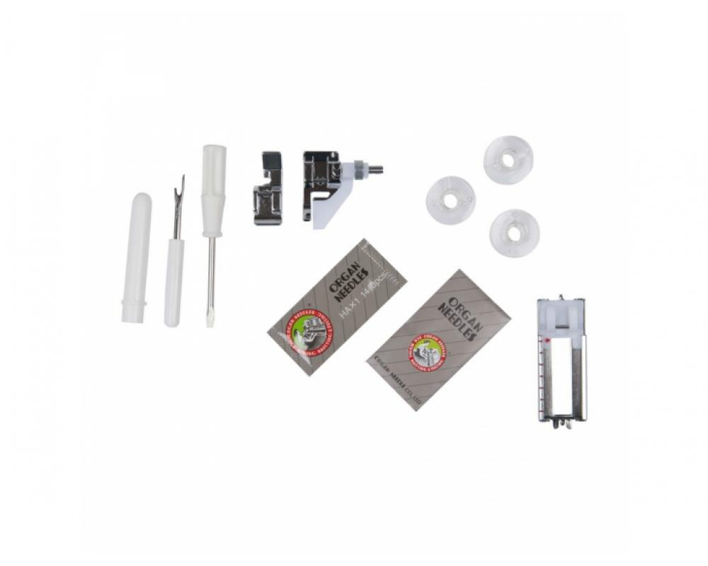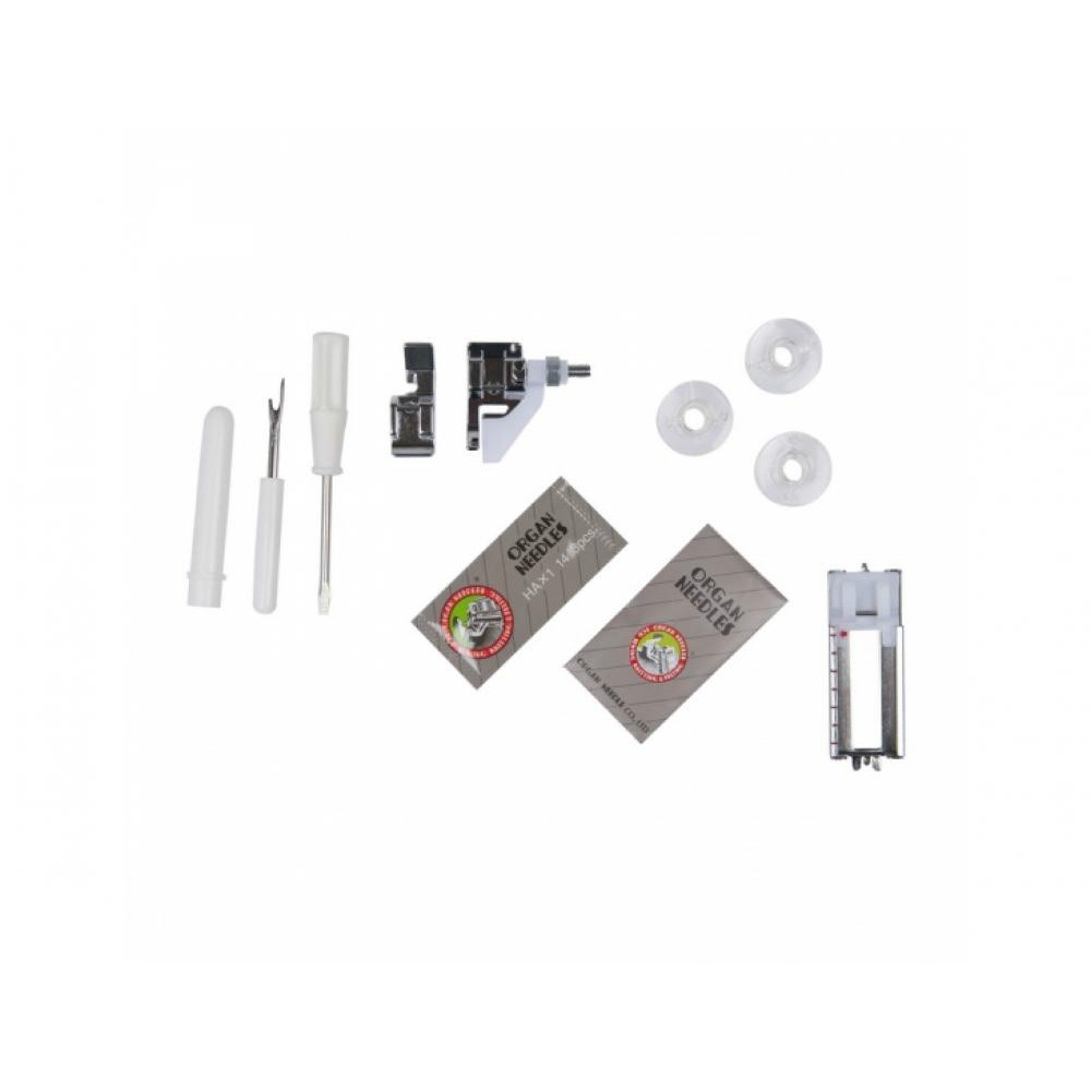 | Комплектация | Универсальная лапка AЛапка для вшивания молнии односторонняяЛапка для потайной строчкиРамка для полуавтоматической петлиШпульки пластиковые 4шт. (3шт. и 1 в машине)Набор игл 3шт.ВспарывательМалая отверткаВиниловый чехол |