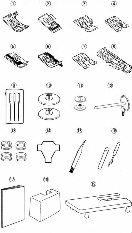 | Комплектация | Лапка универсальная. Лапка для молнии. Лапка для потайного шва. Рамка для петли. Вспарыватель. Отвертка. Набор игл. Штопальная пластина. Шпульки. Педаль. Инструкция на русском языке. |