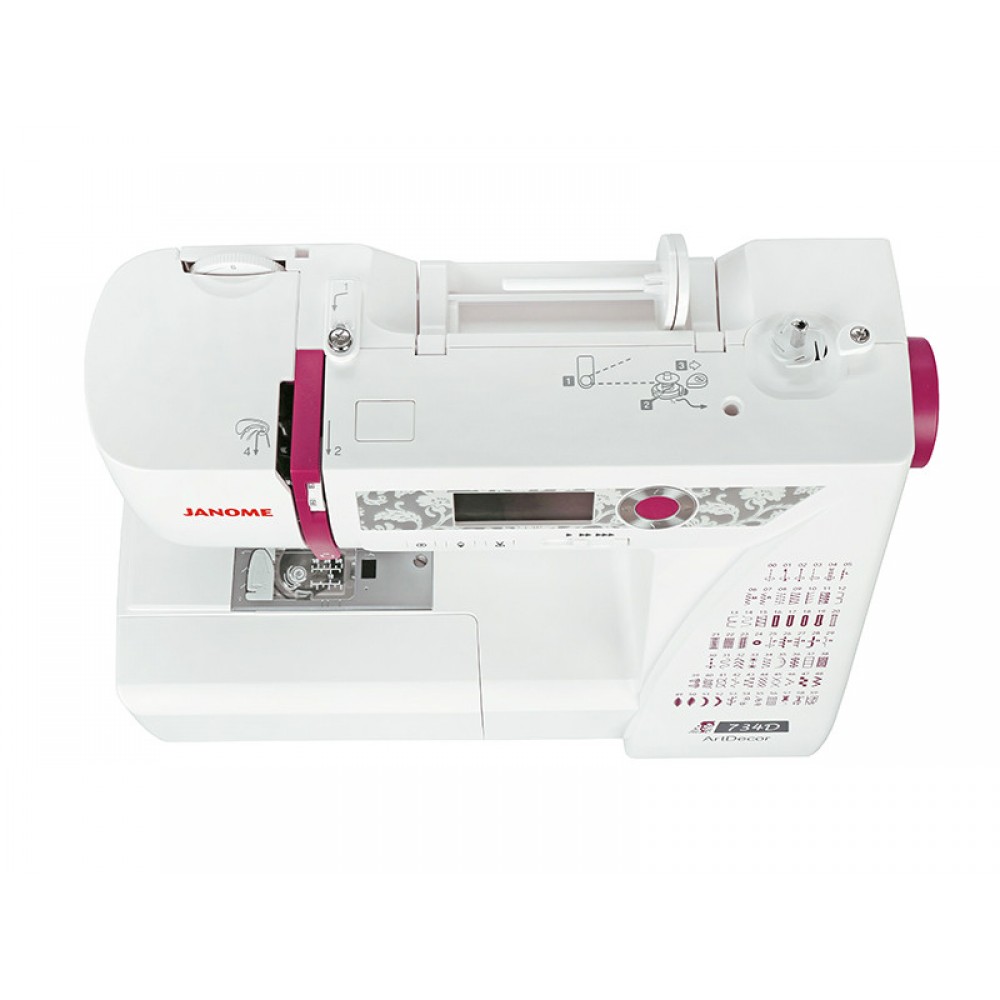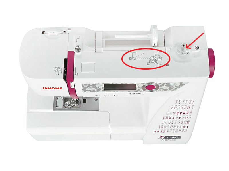 На верхней и передней панели швейной машины Janome ArtDecor 734D нанесена пошаговая схема заправки верхней нити, что облегчит заправку нити.