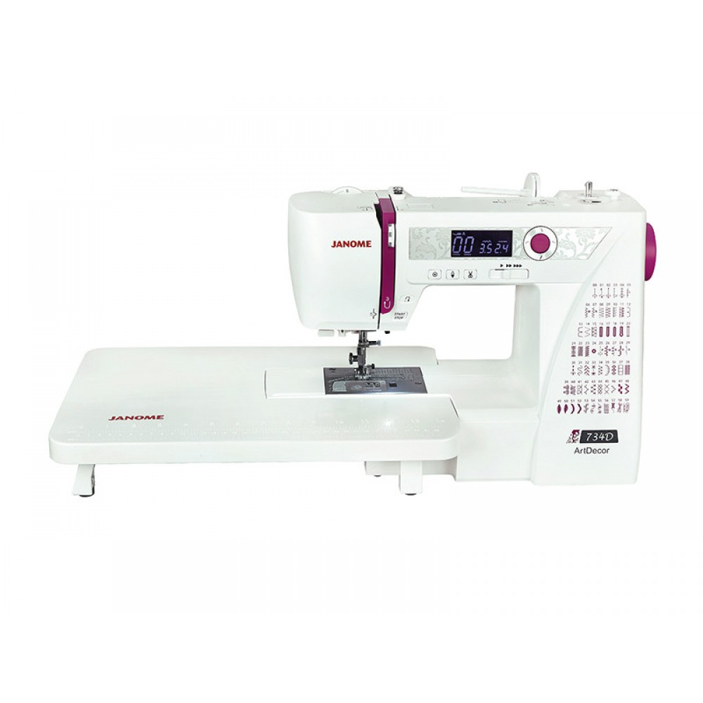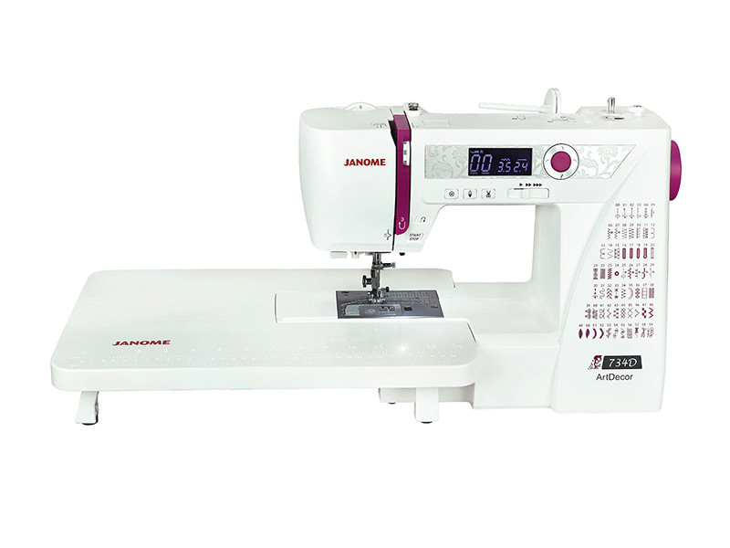 Компьютерная швейная машина Janome ArtDecor 734D имеет расширенный набор швейных операций, включая декоративные строчки и строчки для квилтинга. Шесть видов автоматических петель под пуговицу выполняются с компьютерной точностью. Наличие всех необходимых регулировок, очень удобное управление и хорошая комплектация – вот основные плюсы данной модели. Отличительной особенностью машины является наличие коленного жесткого чехла и большого приставного столика. Машина понравится, как профессионалам, так и любителям шитья и лоскутной техники. На ЖК-дисплее машины отображаются рекомендации и подсказки в виде значков. Используя уникальную разметку на игольной пластине, можно легко сшивать части квилтового проекта под нужным углом. А расширительный столик позволит выполнить изделие любого размера.