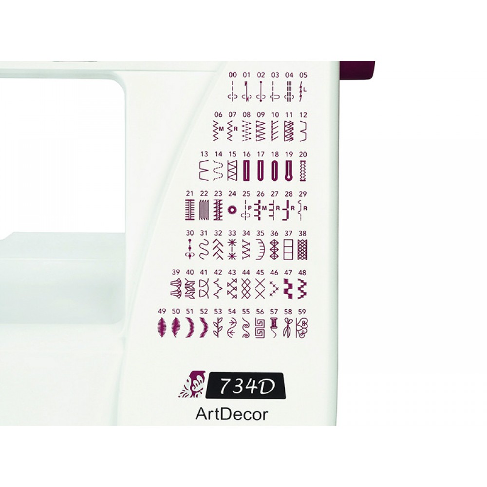 Janome ArtDecor 734D имеет 60 встроенных швейных операций, включая строчки для шитья трикотажных тканей различной степени эластичности, оверлочные строчки для обработки края изделия, 6 видов петель, выполняемых в автоматическом режиме, а также строчки для популярного сейчас направления творчества квилтинг и широкий выбор декоративных строчек.