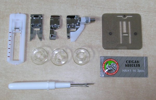 | Комплектация | Универсальная лапка AЛапка для вшивания молнии односторонняяРамка для полуавтоматической петлиЛапка для потайной строчкиШтопальная пластинаШпульки пластиковые 4шт. (3шт. и 1 в машине)Набор игл 3шт.Вспарыватель |
