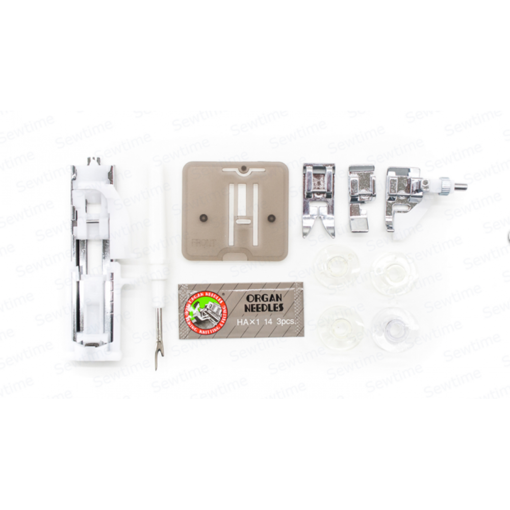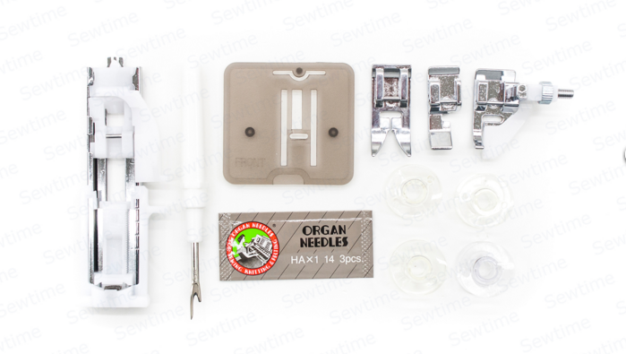 | Комплектация | Лапка стандартная-зигзаг (установлена на машине), для обметывания петель, для вшивания молнии, для потайной строчки, педаль, руководство по эксплуатации (инструкция), иглы стандартные, шпульки, вспарыватель швов, держатель для второй катушки, фетровые (войлочные) прокладки для катушек, отвертка регулировки натяжения в челноке, щеточка для чистки |