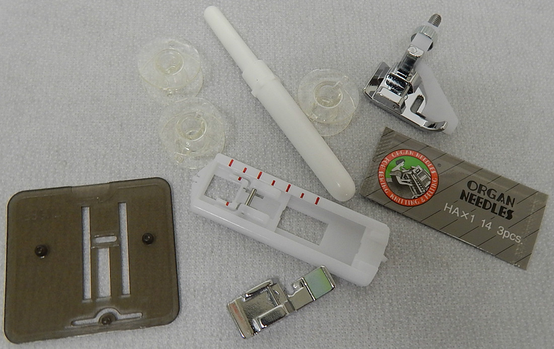 | Комплектация | Универсальная лапка. Лапка для петли. Лапка для потайной строчки. Лапка для пришивания молнии. Шпульки. Набор игл. Вспарыватель. Педаль. Инструкция |