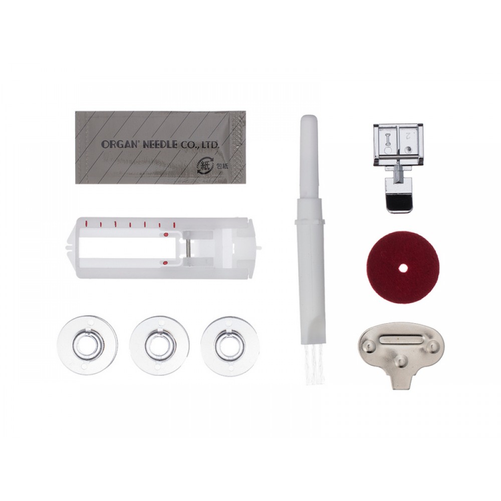 | Комплектация | Универсальная лапка Рамка для выполнения петли Лапка для вшивания молнии Фетровая прокладка Шпульки — 4 шт. (3 шт. + 1шт. в машине) Набор игл ORGAN — 3 шт. Отвёртка-ключ Вспарыватель/щёточка для чистки Педаль Мягкий чехол |