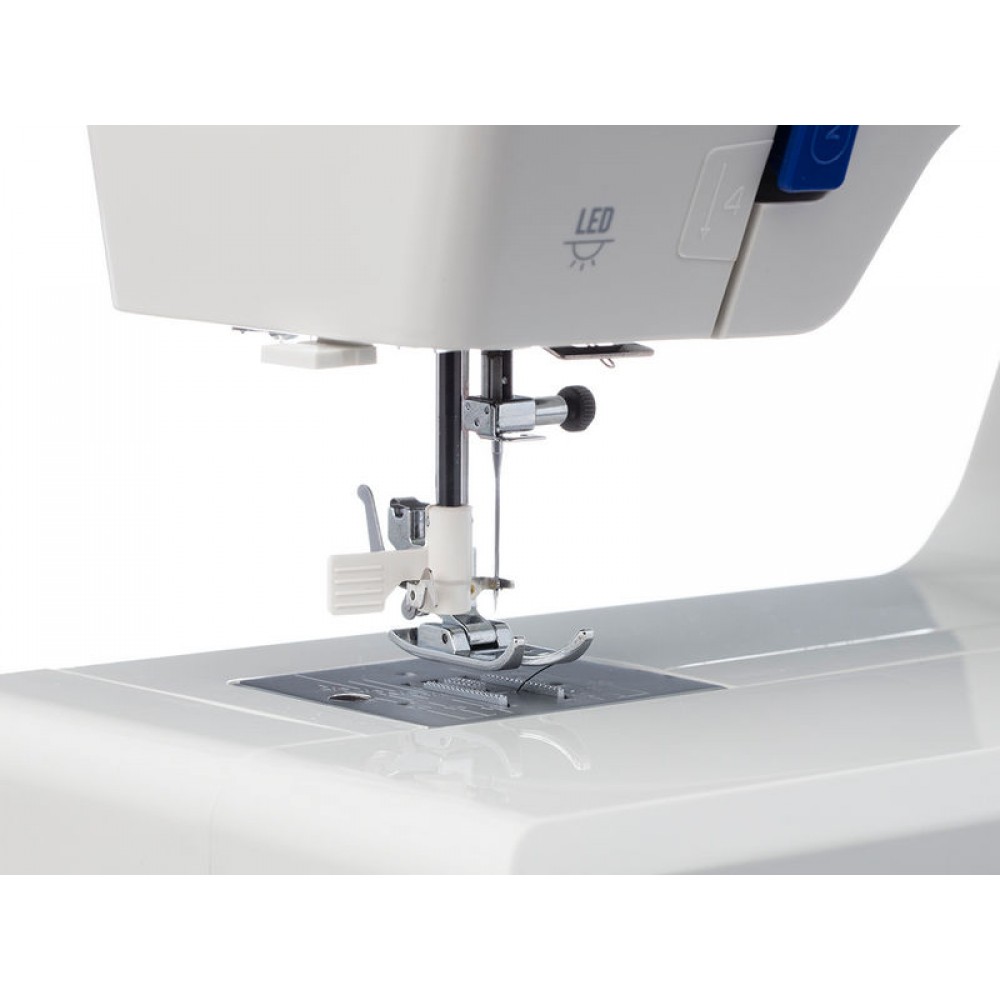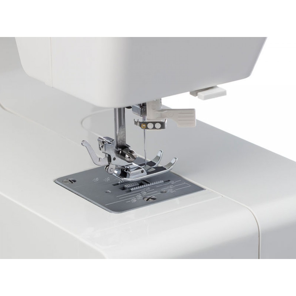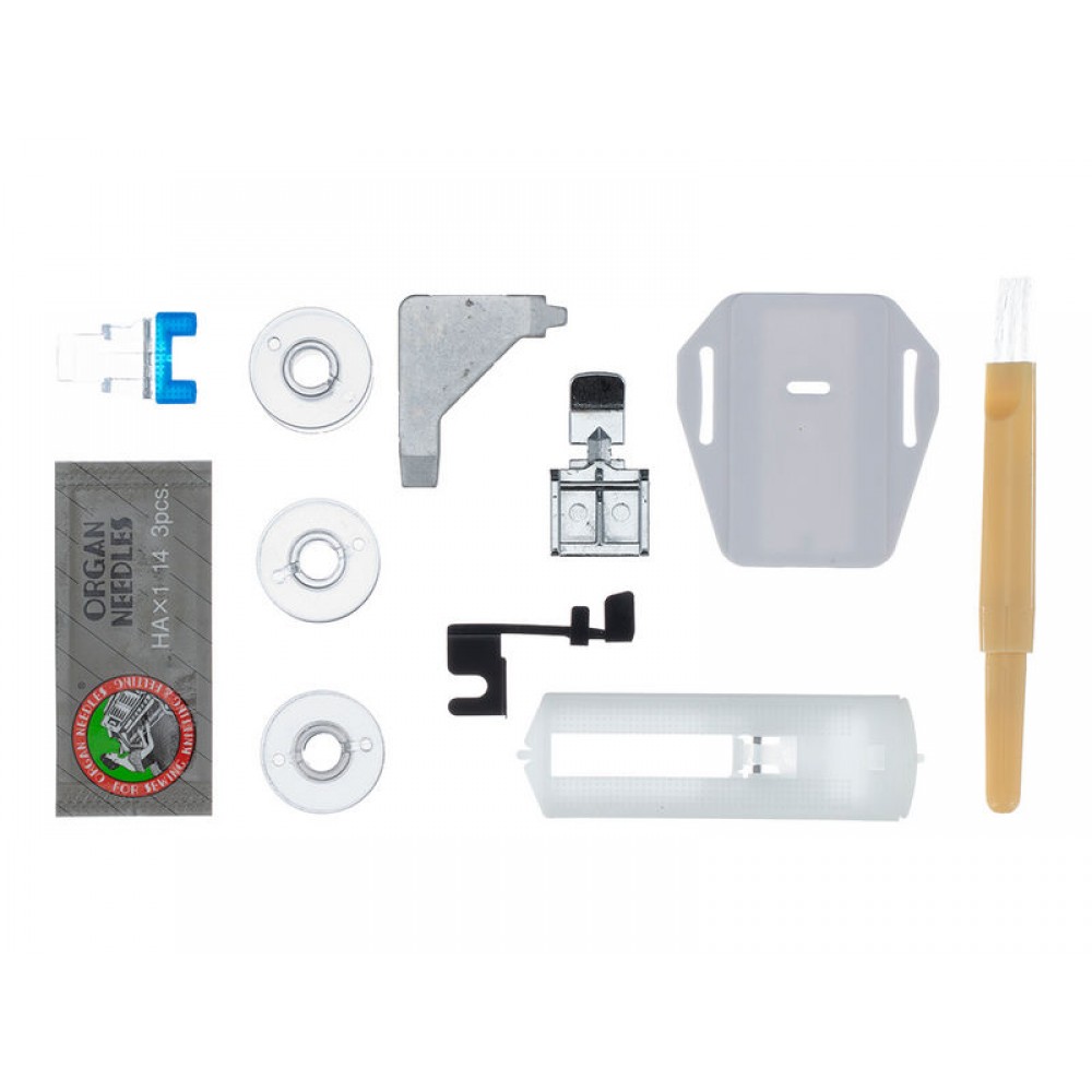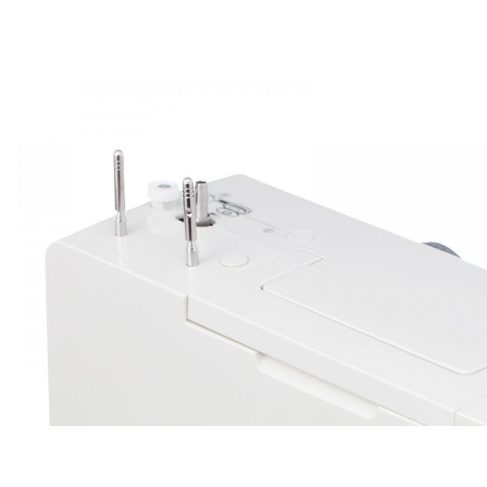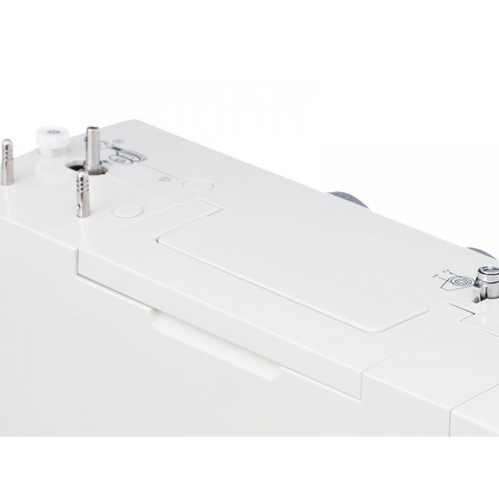 | Комплектация | Универсальная лапка, Рамка для выполнения петли, Направитель для потайного шва, Лапка для молнии двухсторонняя, Лапка для пришивания пуговиц, Шпульки — 4 шт. (3 и 1 в машине), Набор игл — 3 шт., Отвёртка-ключ, Штопальная пластина, Вспарыватель/щёточка для чистки, Расширительный столик, Мягкий чехол, Педаль |