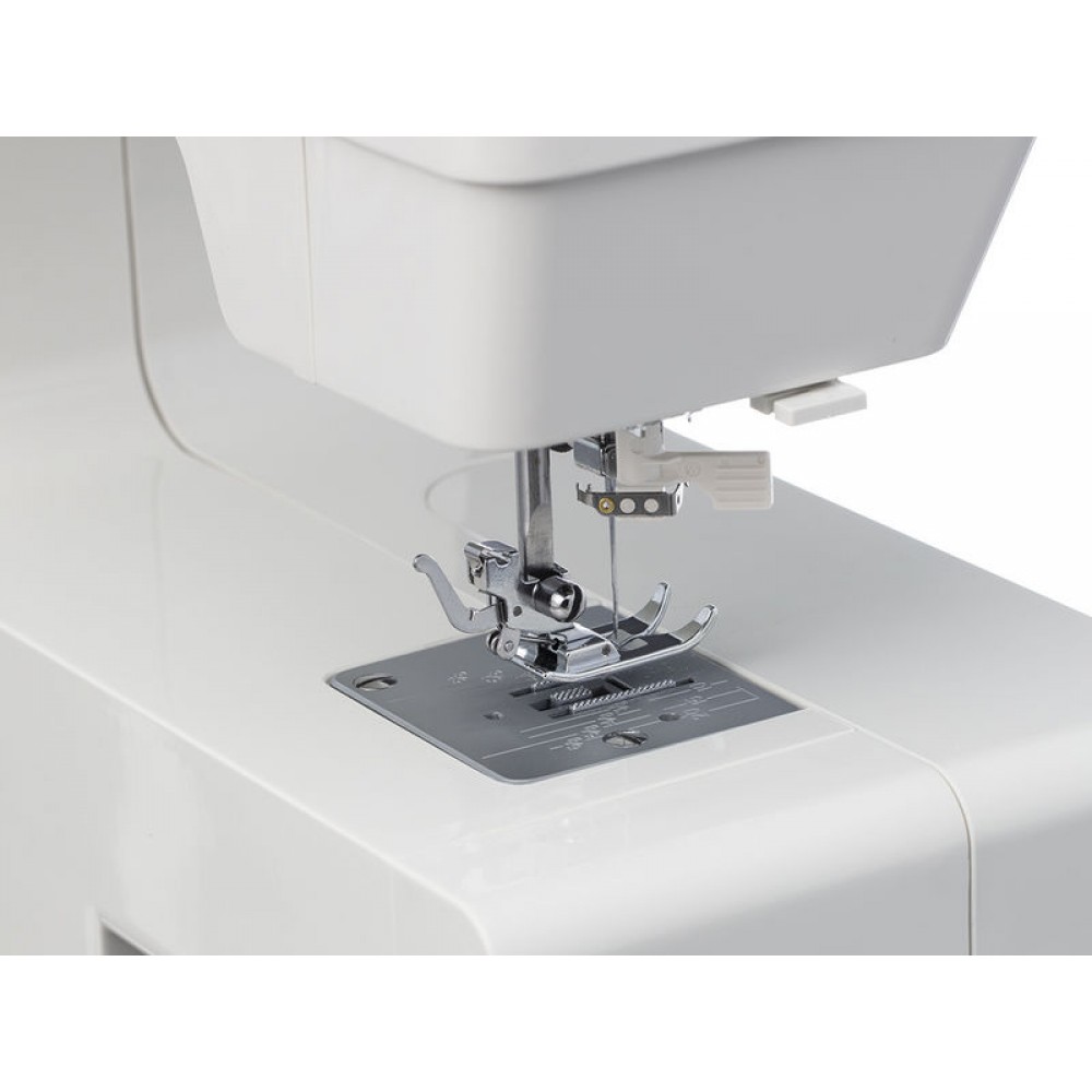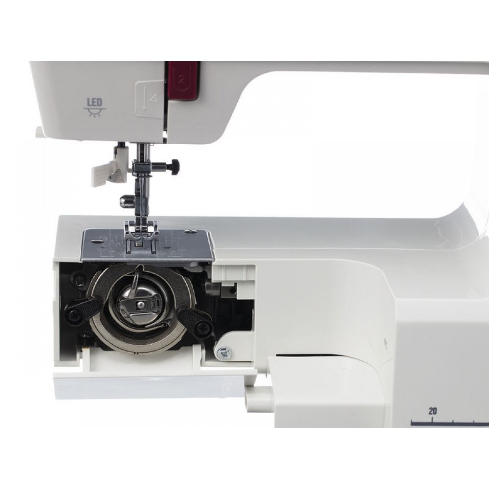 | Комплектация | Универсальная лапка Рамка для выполнения петли Направитель для потайного шва Лапка для молнии двухсторонняя Лапка для пришивания пуговиц Шпульки — 4 шт. (3 и 1 в машине) Набор игл — 3 шт. Отвёртка-ключ Штопальная пластина Вспарыватель/щёточка для чистки Расширительный столик Мягкий чехол Педаль |