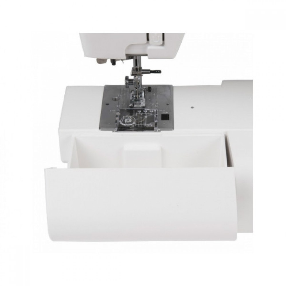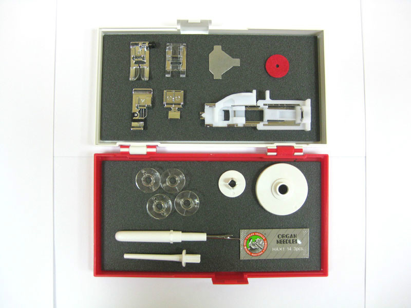 | Комплектация | Лапка для атласных строчек FЛапка для автоматической петли RЛапка оверлочная MЛапка для молнии ЕОтвёрткаВспарывательНабор иглШпульки (3+1 в машине)Подставка под катушкуБольшой держатель катушкиМаленький держатель катушкиДополнительный стержень для катушкиФетровая прокладка для катушкиМягкий чехолНаправитель ткани для простегивания. Вспарыватель. Набор игл (5 шт.). Дополнительный катушечный стержень. 2 отвертки. Щетка для чистки. 2 держателя катушки. Фетровая подкладка. Шпульки пластиковые (5шт.). Педаль. Инструкция |