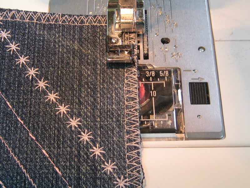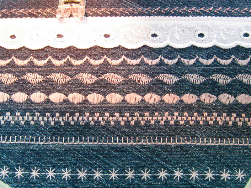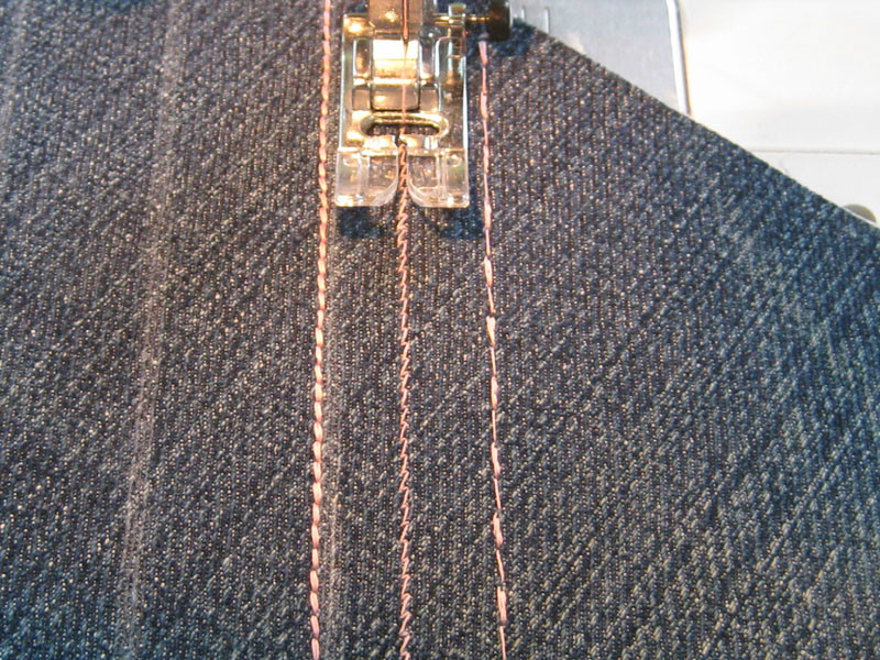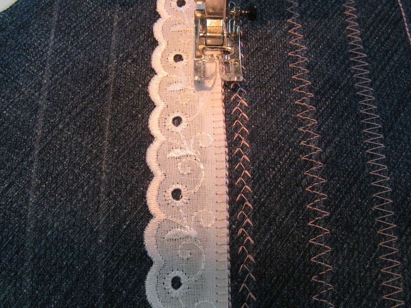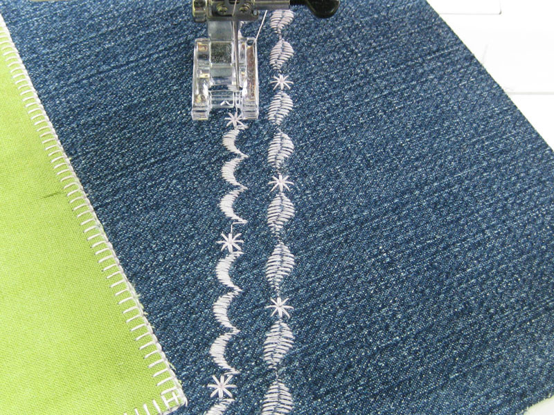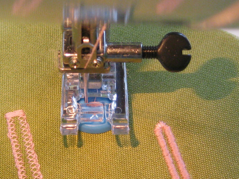 При работе с декоративными строчками используйте прозрачную лапку. Она позволяет Вам видеть как ложится строчка.