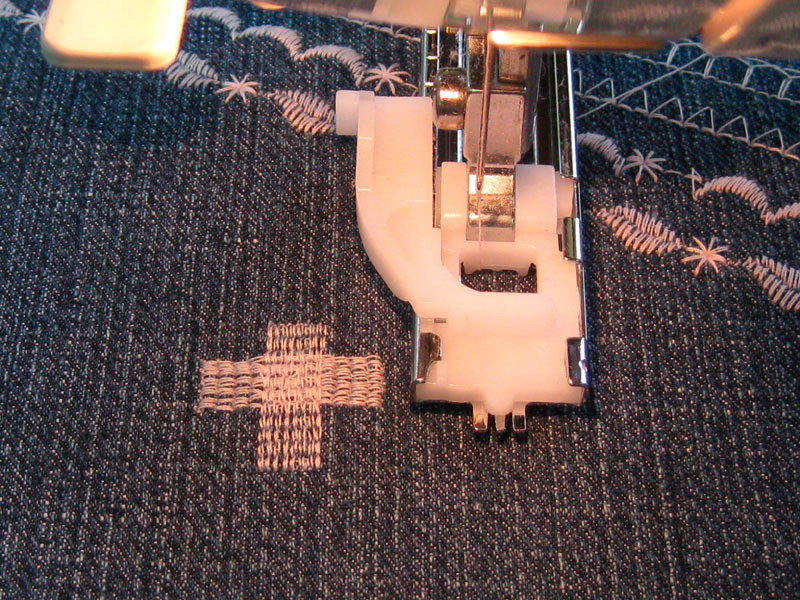 При помощи прозрачной лапки Вы сможете пришить аппликацию или тесьму.
