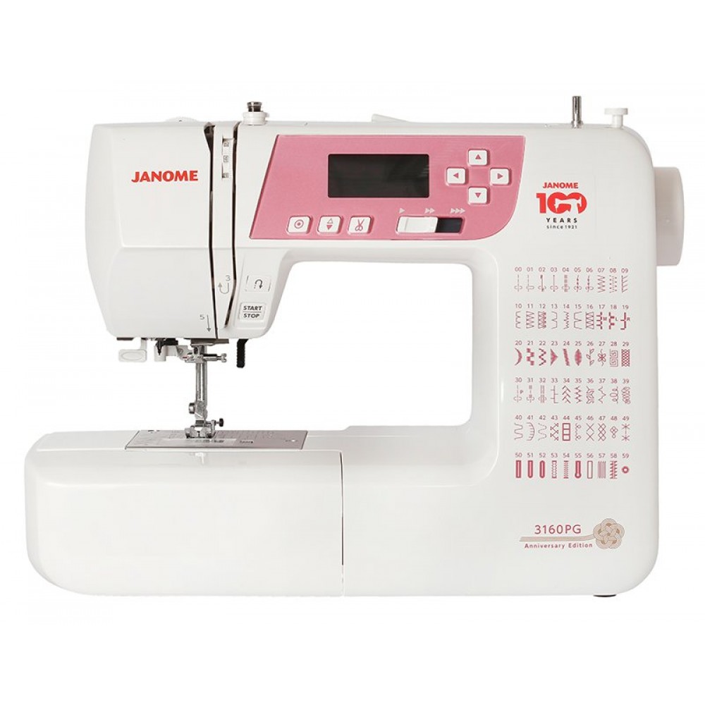 Компьютерная швейная машина Janome 3160PG Anniversary Edition - швейная машинка. выпущена к юбилею компании Janome. Имеет богатый функционал и расширенную подарочную комплектацияю. Janome 3160PG Anniversary Edition имеет расширенный набор швейных операций, включая декоративные строчки и строчки для квилтинга. Все петли выполняются в автоматическом режиме. Машина оснащена функцией автоматической закрепки и обрезки нити, что облегчает работу. Используя уникальную разметку на игольной пластине, можно легко сшивать части квилтового проекта под нужным углом. Благодаря расширительному столику вы с лёгкостью создадите большой творческий проект или изделие. Швейный советник поможет выбрать нужные параметры: жк-дисплей с подсветкой отображает рекомендации и подсказки в виде знаков по каждой швейной операции. В честь 100-летнего юбилея в подарок идёт бонусная комплектация. Машина понравится, как профессионалам, так и любителям шитья и лоскутной техники.