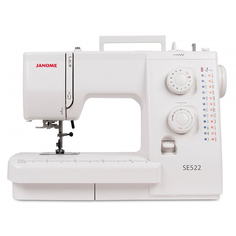 Janome SE 522 имеет горизонтальный челнок. Скорость шитья на этой машине может достигать максимального значения 860 стежков в минуту. Машинка способна выполнять 23 швейные операции и петли в режиме автомат. Конструкция предусматривает регулировку давления лапки, натяжения верхней нити и отключение механизма подачи ткани. Кроме того, есть кнопка реверса и система измерения размера пуговиц, освещение, нитевдеватель, отсек для аксессуаров.