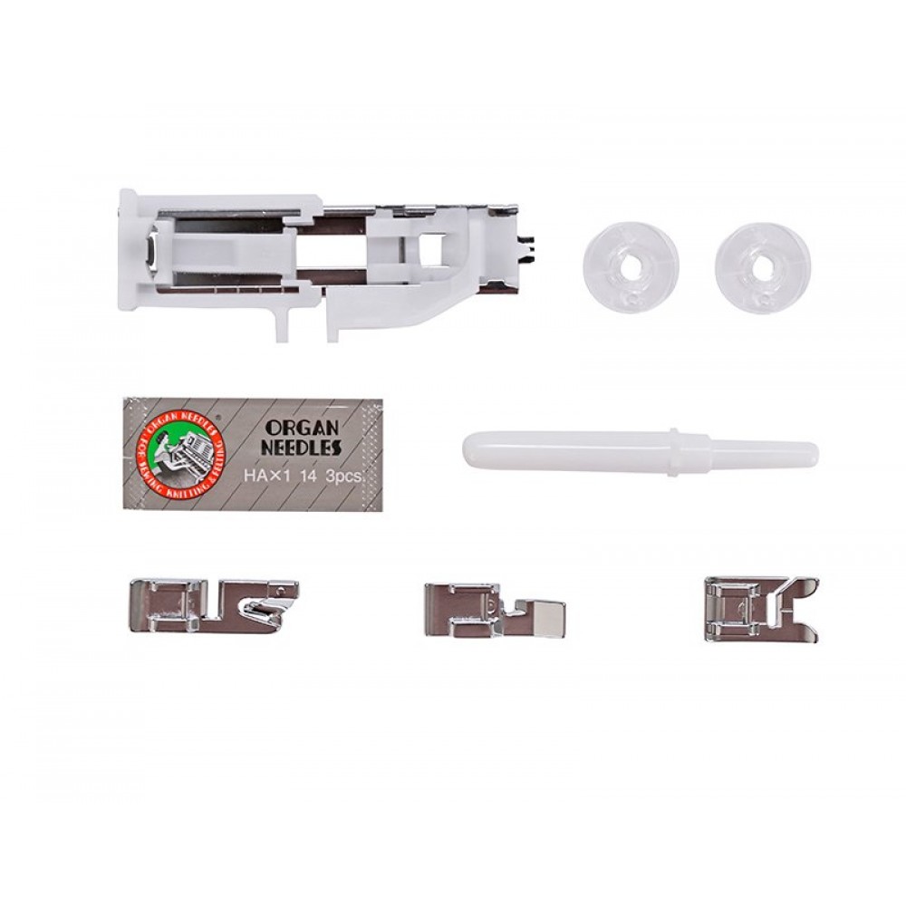 | Комплектация | Универсальная лапка,Лапка для вшивания молнии односторонняя,Рамка для полуавтоматической петли,Лапка для потайной строчки,Шпульки пластиковые 4 шт. (3 шт. и 1 в машине),Набор игл 3шт.,Вспарыватель,Малая отвёртка,Штопальная пластина, Педаль, Инструкция на русском языке. |