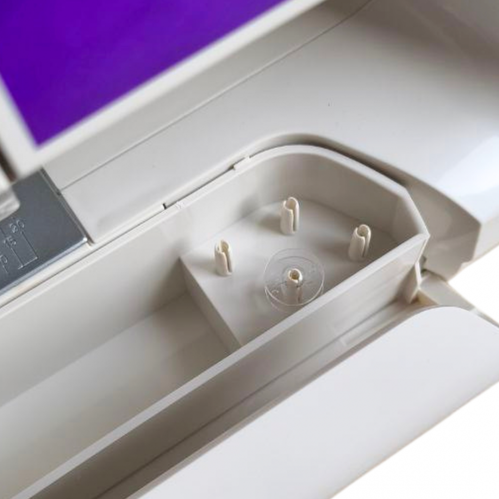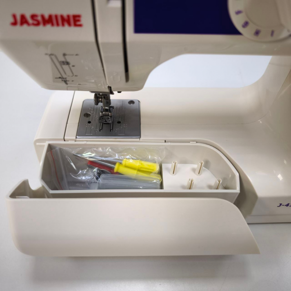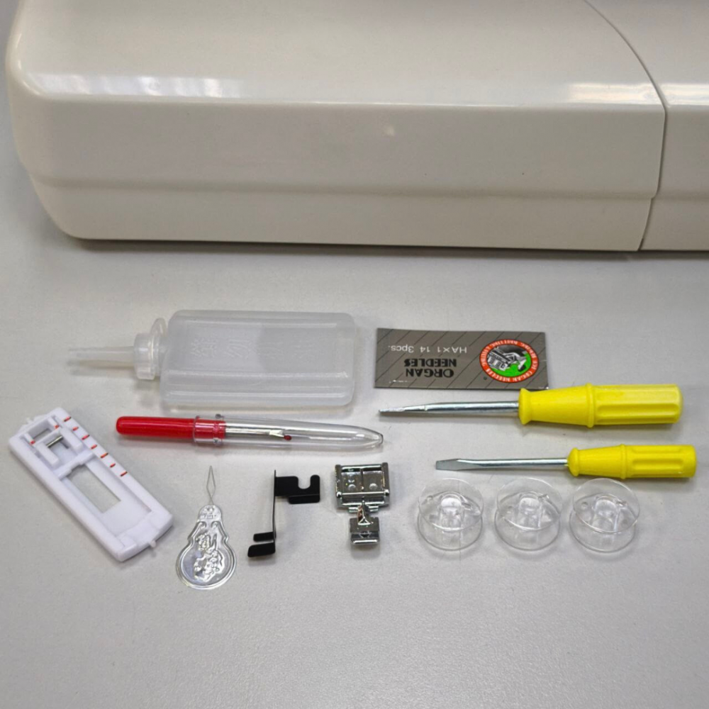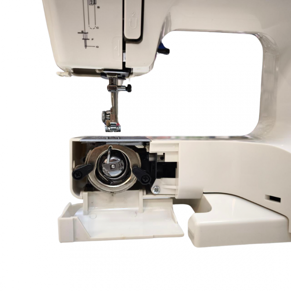 | Комплектация | Шпульки прозрачные Вспарыватель Комплект игл Лапка для пуговичной петли Лапка для вшивания молнии Устройство для потайной строчки Нитевдеватель ручной Отвертки Масленка |