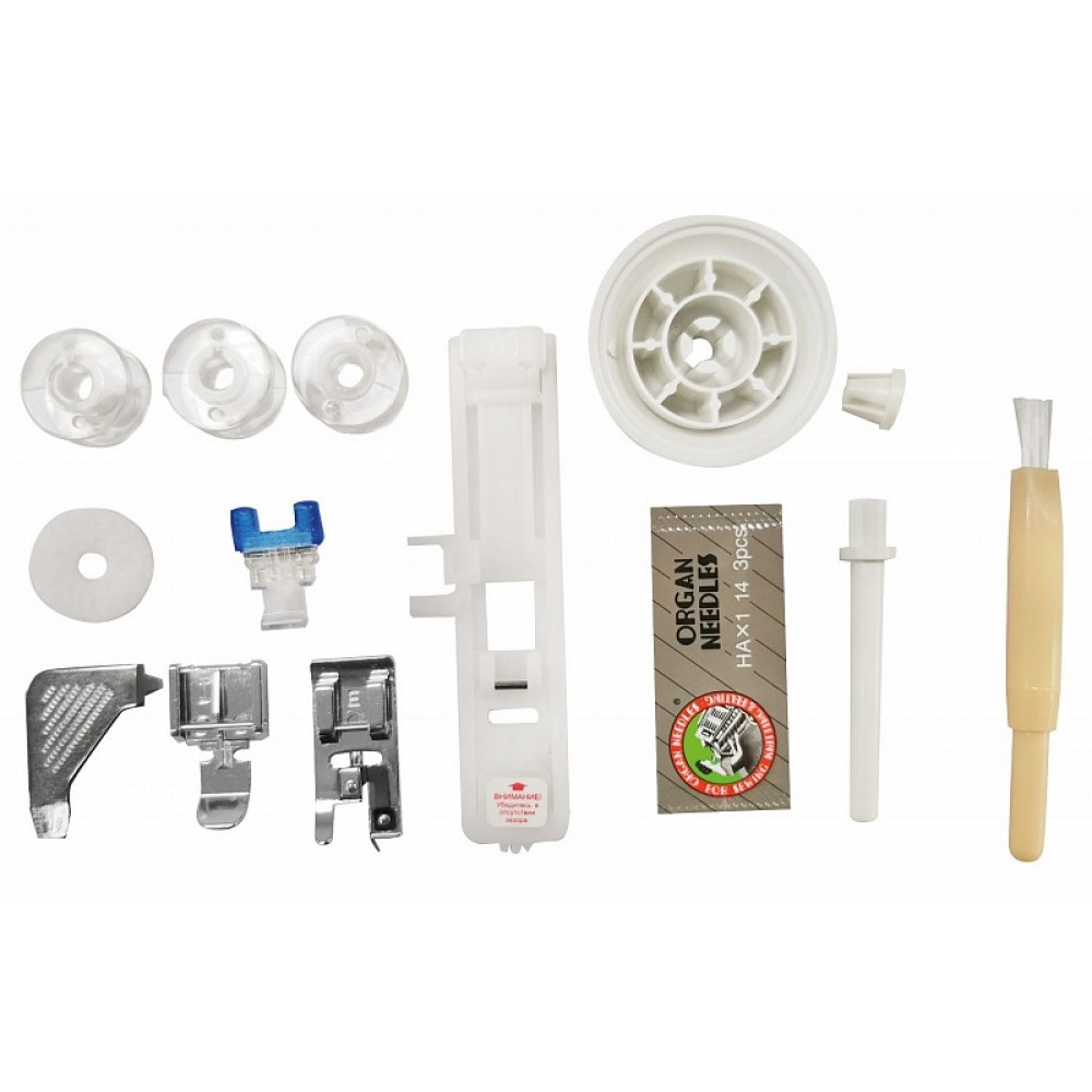 | Комплектация | Универсальная лапка Лапка для молнии двусторонняя Лапка для автоматической петли Оверлочная лапка Лапка для пришивания пуговиц Шпульки – 3 шт. Держатель катушки большой и малый Фетровая прокладка Отвёртка-ключ Вспарыватель-щёточка от пыли Комплект игл Второй катушечный вертикальный стержень Таблица с образцами строчек Дополнительный расширительный столик Мягкий чехол Педаль Шнур питания Инструкция на русском языке |