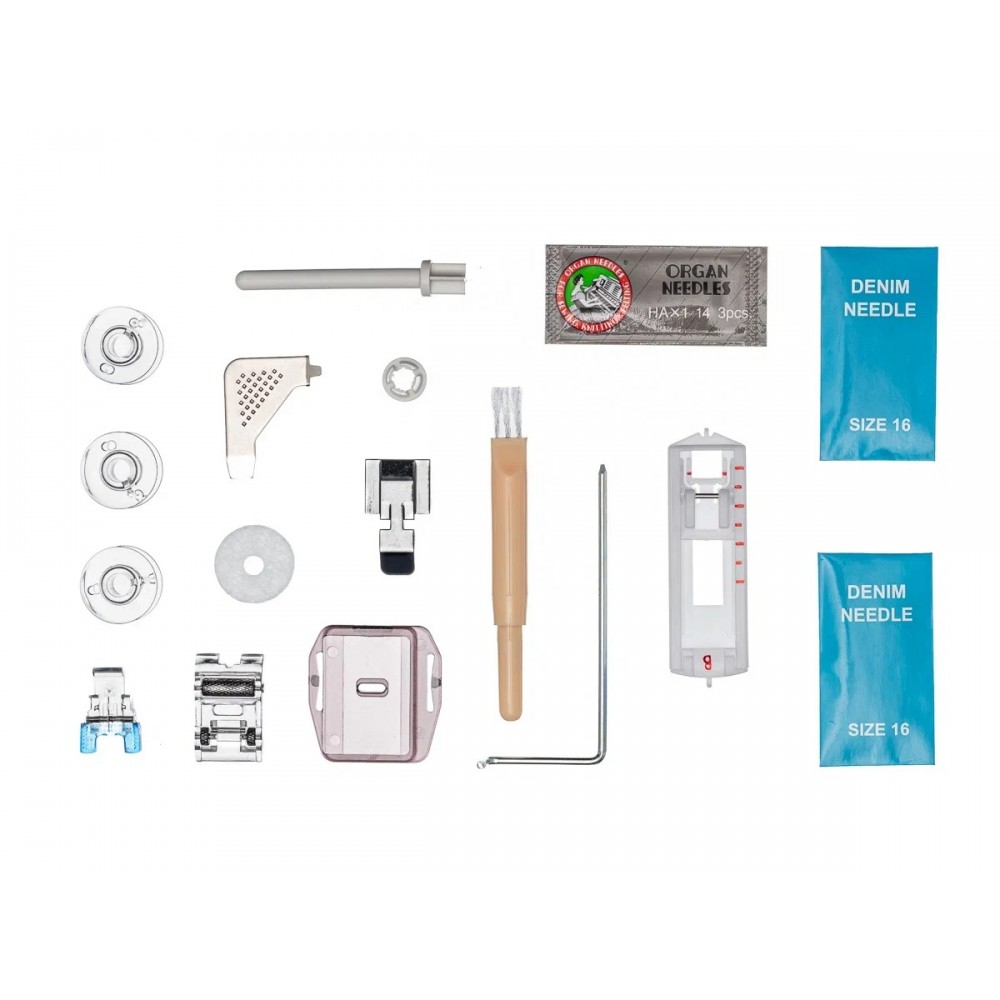 | Комплектация | Универсальная лапка. Лапка для выполнения петли. Лапка для вшивания молнии. Лапка для пришивания пуговиц. Направитель для квилтинга. Штопальная пластина. Набор игл (3 универсальных + 2 деним) Шпульки 4 шт. Педаль. Отвёртка-ключ. Фетровая прокладка. Щеточка-вспарыватель. Педаль. Инструкция на русском языке. |